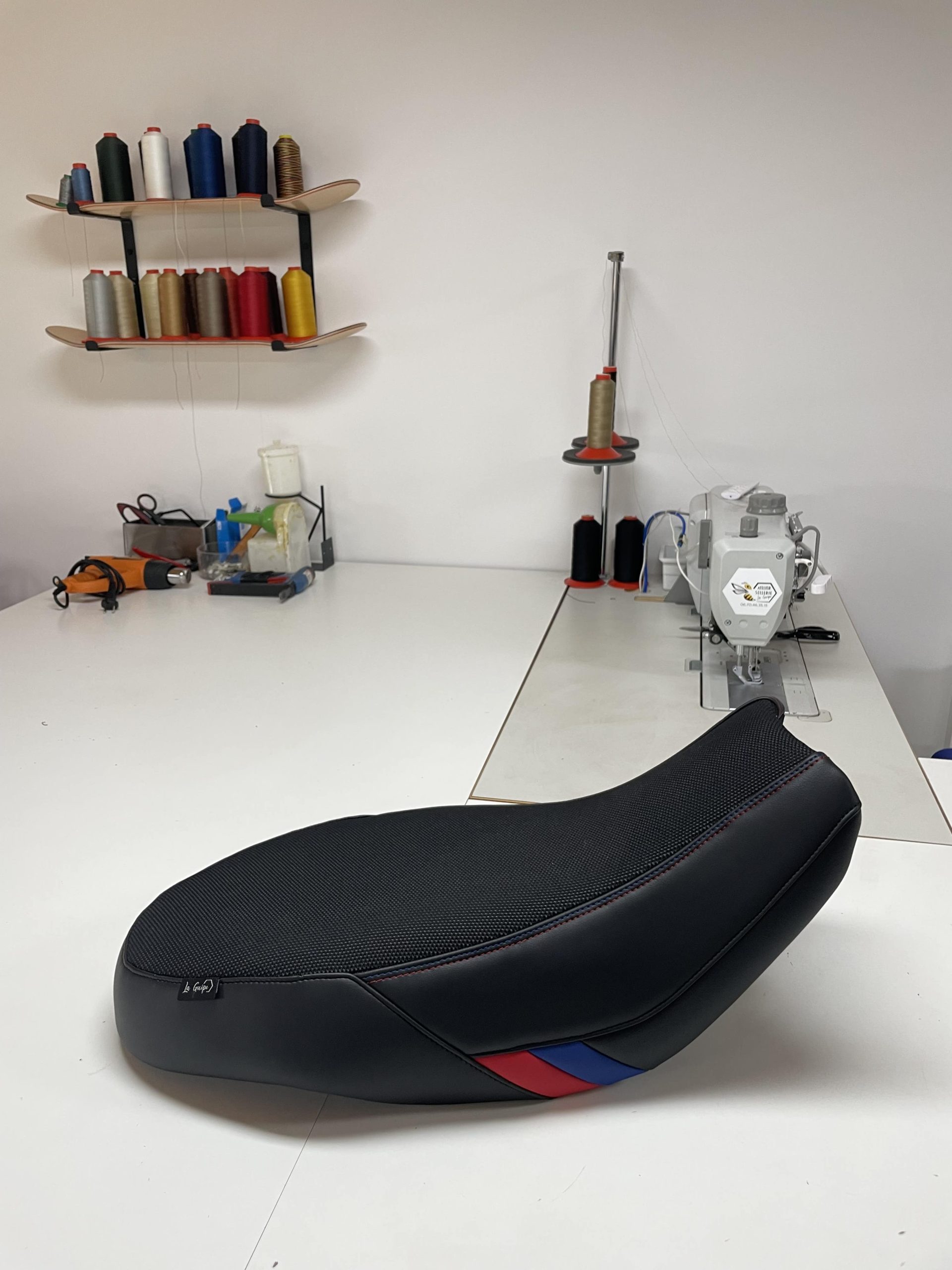 Personnalisation de la garniture de la selle de cette Desert Sled, avec un nouveau design de la garniture avec combinaison de différents types de simili moto.